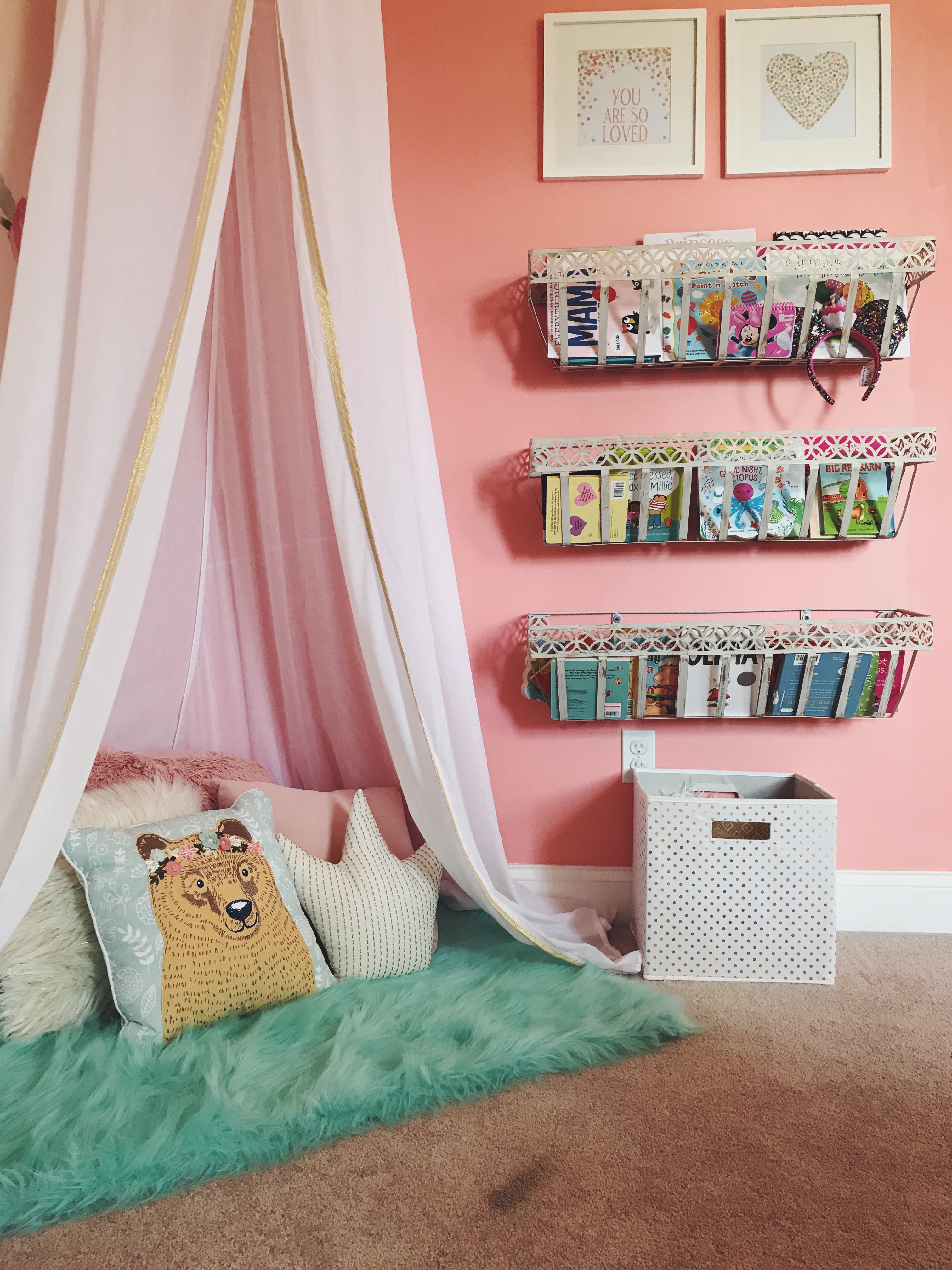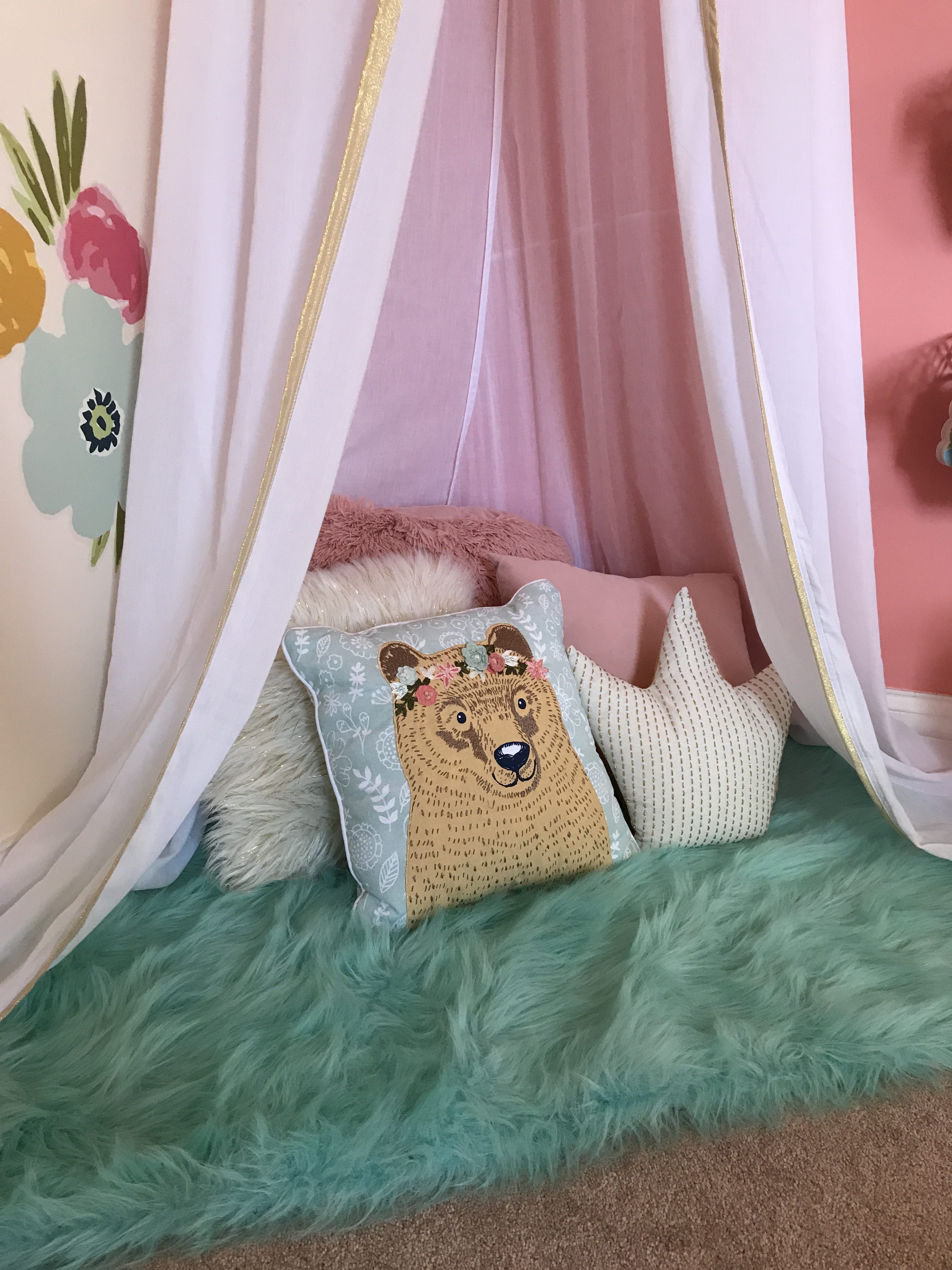 The reading nook is one of my favorite things about her room. A gold sequin canopy and throw pillows from Target, over a faux fur shag rug from Walmart. A cozy corner was easily created.
